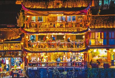 2月13日,游客在湖南省湘西土家族苗族自治州永顺县芙蓉镇游玩。 唐雍钧摄(影像中国)