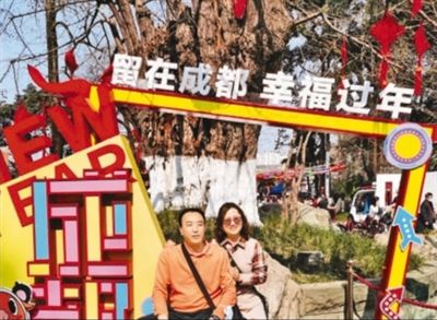 2月14日,一对留蓉过年的外地夫妇在四川省成都市百花潭公园合影留念。 本报记者 王明峰摄