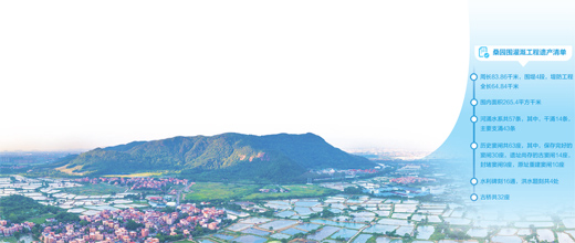 桑园围位于佛山市南海区和顺德区境内,始建于宋朝,后经数次修筑完善,逐渐形成集围垦、灌溉、防洪、抗旱、交通、运输、养殖等多种功能于一体的大型基围水利工程。2020年12月8日,佛山桑园围入选为第七批世界灌溉工程遗产,成为我国首个以基围水利为主体的世界级遗产。