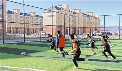 近年来,新疆维吾尔自治区哈密市伊吾县盐池镇大力推进城镇化,新建的集中搬迁安置小区让900多户农牧民有了新居。图为小朋友们在幻彩园安置小区足球场踢球。 |