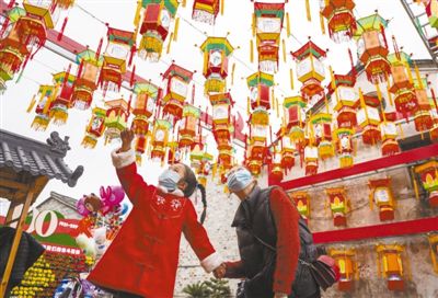 近日,浙江省宁波市宁海县前童古镇推出舞狮舞龙、民俗体验等活动,吸引游客前来游玩,享受春节假期。图为游客在观看花灯。