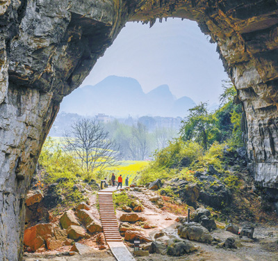 2月24日,湖南道县清塘镇月岩风景区,游客走在乡间小道上。近日,随着气温逐步回升,当地油菜花竞相绽放,与远山、农家交相辉映,吸引不少游客前来观赏。
