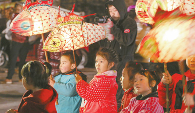 2月24日,安徽省黄山市歙县溪头镇汪满田村,手持鱼灯的小朋友。
