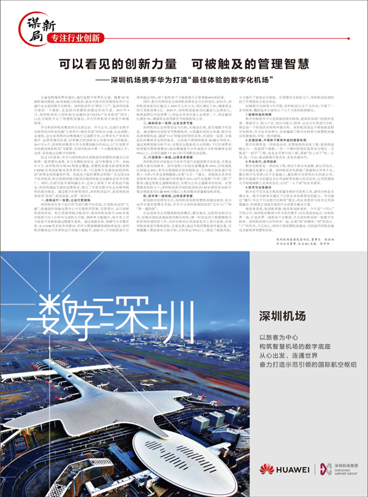 华为和深圳机场集团同为在深企业。华为认为,交通行业数字化转型的目标是构建“人悦其行·物优其流”的综合交通,从全流程、全架构、全生命周期的全维度践行交通数字化,以带来生产效率的提升、运营管理的改善、经营模式的创新及公共服务能力的提高。2017年6月,深圳机场集团与华为签署战略合作协议,以“打造数字化的最佳体验机场”为愿景,在国内机场中第一个从整体规划入手,全面、系统地启动数字化转型。