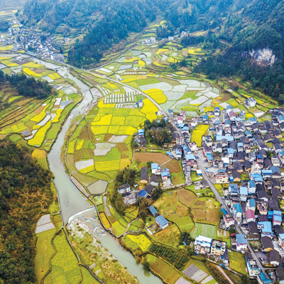 春回大地,湖南省湘西土家族苗族自治州的油菜花开,与村寨、田园构成了一幅美丽画卷。图为3月8日,吉首市乾州街道西门口村田园景色。