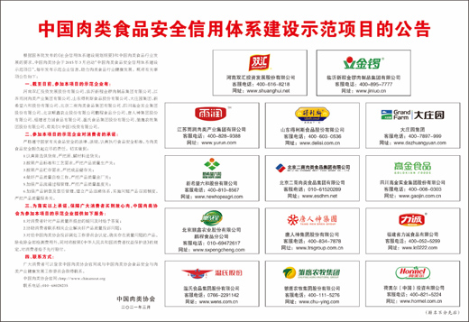 根据国务院发布的《社会信用体系建设规划纲要》和中国肉类食品行业发展的要求,中国肉类协会于2015年3月启动“中国肉类食品安全信用体系建设示范项目”,每年发布示范企业信息,助力肉类食品行业健康发展。现将有关事项公告如下: