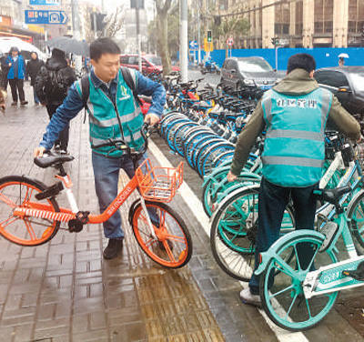 巨云鹏(左)与姜晓辰一起整理人行道上的共享单车。 |