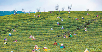 春分前后,茶园内春意盎然,茶农们纷纷抢抓农时摘春茶,与阶梯状的茶山共同构成一幅美丽的画卷。
