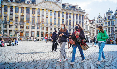 比利时近期公布了分阶段“解封”方案。从三月八日起,在戴口罩及保持社交距离的前提下,室外聚会的人数可由四人增加到十人;自四月一日起,可举办五十人以内的户外文化活动;限制“非必要”出入境的规定将至少保持到四月十八日。图为近日,人们在比利时布鲁塞尔大广场游览。