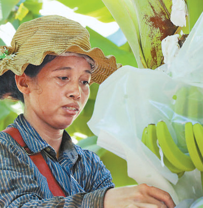 在柬中热带生态农业合作示范区内,工人给香蕉套袋。 |