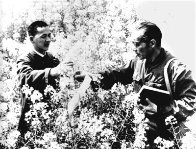 1963年,傅廷栋(左)在导师刘后利的指导下进行油菜研究。 |