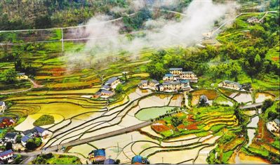 3月22日,重庆万盛经开区丛林镇绿水村春意盎然,晨雾缭绕。