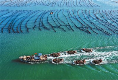 日前,山东省荣成市规模养殖的海带进入收获季节,收割工作有序开展。工人们趁着晴好天气抢收海带,保障市场供应。图为3月22日,在荣成一处养殖区,满载海带的舢板驶向码头。