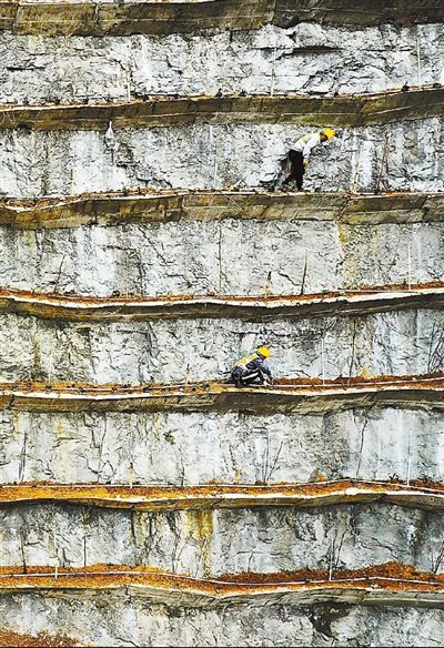 图为3月22日,柳州市楼梯山山体复绿工程施工现场,工人在挡土板上植树。
