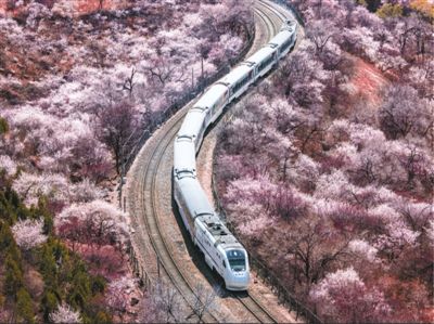 春暖花开之际,北京市郊铁路S2线列车搭载乘客欣赏沿途美景,领略巍峨长城的人文景观与山花烂漫的自然风光,被游客誉为“开往春天的火车”。
