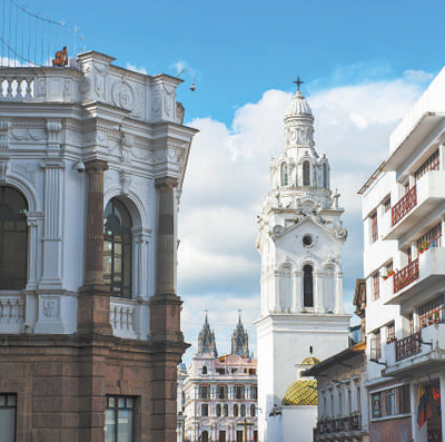 厄瓜多尔首都基多坐落于安第斯山脉的山谷之中,是个南北延伸的狭长城市,新城在北,老城在南。老城的历史可以追溯到1534年,至今仍基本保持着当年的格局和风貌。鹅卵石街巷纵横交错,状似棋盘,数个广场点缀其间,把老城连接为一个整体,政府机构、教堂等主要建筑都环绕广场而建。