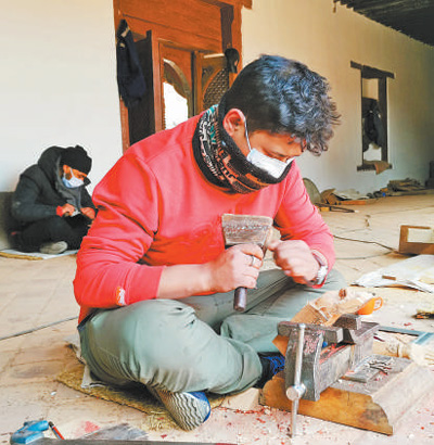 在九层神庙修复项目现场,尼泊尔工匠正在雕刻神像。 |