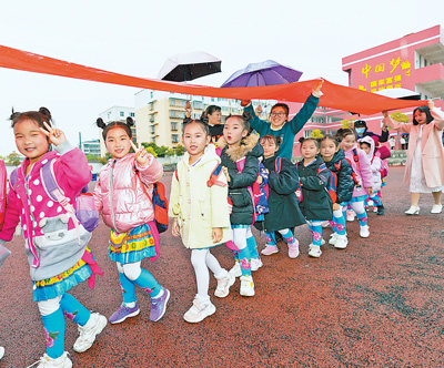 中央广播电视总台体育青少节目中心近日来到南水北调中线工程核心水源区湖北省丹江口市,录制“大手牵小手,同饮一江水”公益活动,恰逢丹江口市喜降春雨。图为该市新港小学的老师们用横幅遮雨,护送参加节目录制的同学们返回排练厅。