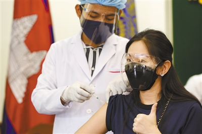 4月1日,柬埔寨开始为国民接种中国科兴新冠疫苗。图为一名女子在柬首都金边接种第一剂科兴新冠疫苗。 |