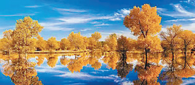 甘肃省酒泉市金塔沙漠胡杨林从上世纪60年代开始种植,现面积已达8万余亩,成为大漠戈壁上的一道亮丽风景。 |