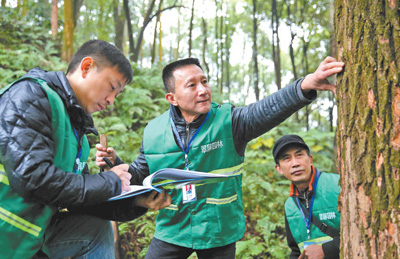 四川省宜宾市翠屏山人造城市森林公园绿化覆盖面积达160公顷,图为护林工在记录树木的情况。 |