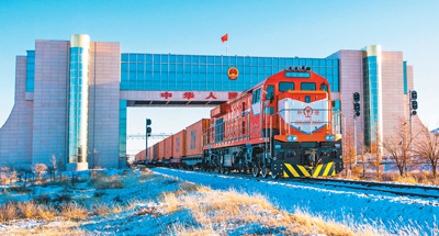 在内蒙古二连浩特,一列中欧班列完成边防检查后驶过国门。 |