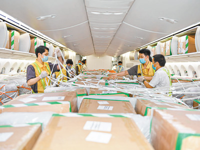 3月26日,工作人员在海南航空HU787航班内固定货物。3月27日,该航班搭载35吨货物从海口美兰国际机场飞往法国巴黎,海南自贸港首条定期洲际货运航线正式开通,为海南自贸港搭建国际物流“空中通道”。 |
