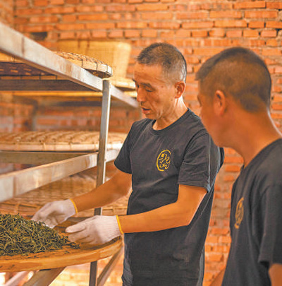 金容纹(左一)正在制作茶叶。 |