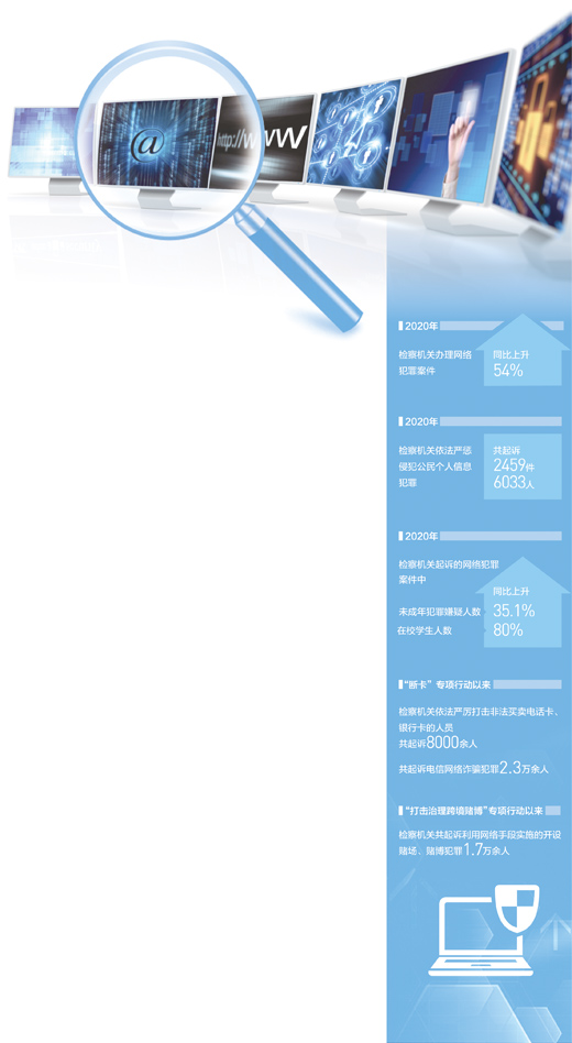 “当前,网络犯罪的非接触性降低了犯罪的悖德感,加之犯罪专业门槛降低、收益较高,致使大量法律意识薄弱、社会经验不足的年轻人掉进犯罪‘陷阱’。”赵玮介绍,2020年,检察机关起诉的网络犯罪案件中,未成年犯罪嫌疑人数同比上升35.1%,在校学生人数同比增长80%。