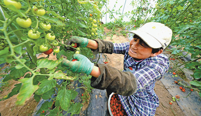 山东菏泽市曹县孙老家镇程庄村建立五色西红柿生产基地,解决了村民就业问题。图为4月8日,村民在大棚里采摘五色西红柿。 |