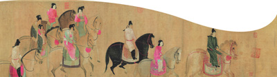 《虢国夫人游春图》(局部),传为唐代张萱绘制,原作已佚,现存的是宋代摹本,藏于辽宁省博物馆。画中男女骑从八人行进状,服饰轻薄而鲜明。 |