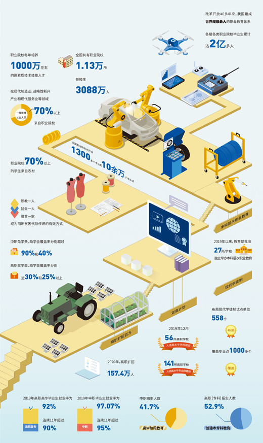目前,我国已建成世界规模最大的职业教育体系。“职教20条”发布,明确职业教育与普通教育是两种不同教育类型,具有同等重要地位。职业教育在培养技能人才、服务就业民生、助推产业升级、助力乡村振兴等方面日益发挥着重要作用。