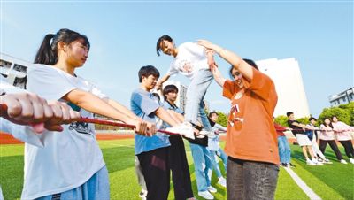 4月13日,江西省赣州市会昌县第三中学学生在进行趣味游戏。当日,该中学组织了一场趣味拓展训练,学生们在一个个游戏和团队项目中,增进友谊、放松心情,享受运动带来的快乐。