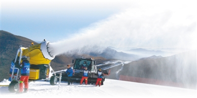 2022年冬奥会崇礼赛区,工作人员在进行人工造雪。 |