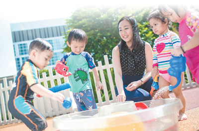 在新加坡一家幼儿园,老师正和小朋友们一起开展课间活动。 |