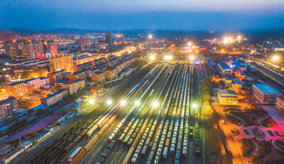 4月20日,内蒙古乌兰察布市繁忙的集宁站货运站场停满编组待发的货物列车。