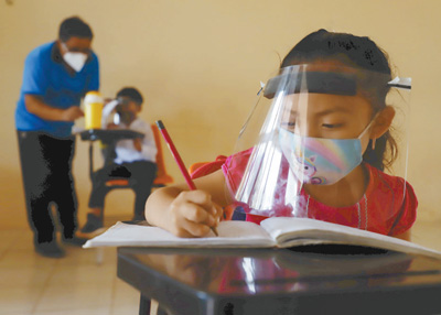 因新冠肺炎疫情居家学习一年后,墨西哥坎佩切州的学生们开始重返校园。图为4月19日,墨西哥坎佩切州蒙特韦约一所小学的学生戴着口罩和面罩上课。当日是该校复课第一天。