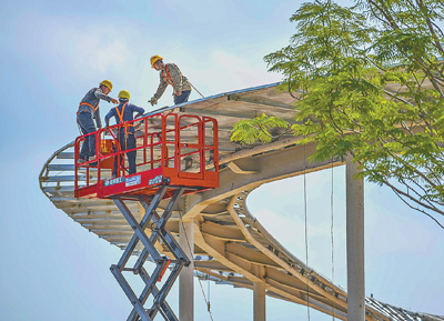 4月23日,在海南省海口市西海岸南片区生态修复工程项目施工现场,工人正在给游客中心顶部加装曲面铝单板。目前,西海岸南片区生态修复工程加快建设。据了解,海口市西海岸南片区生态修复工程项目总占地面积约1118亩,将海口城市文化底蕴与地域特色融合,打造复合型生态地标级综合公园,提升海口市民及游客的生活品质。