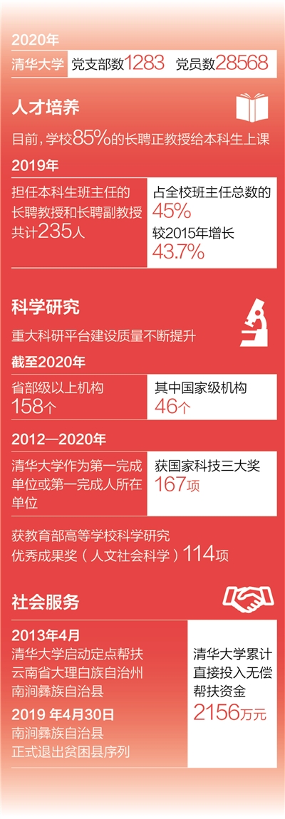 一流大学建设要坚持党的领导。从1926年11月建立清华第一个中国共产党党支部开始,清华大学党组织从未间断,逐步发展壮大。2018年,清华大学党委入选首批“全国党建工作示范高校”创建单位,马兰花开党支部是清华大学标兵党支部的先进典型。