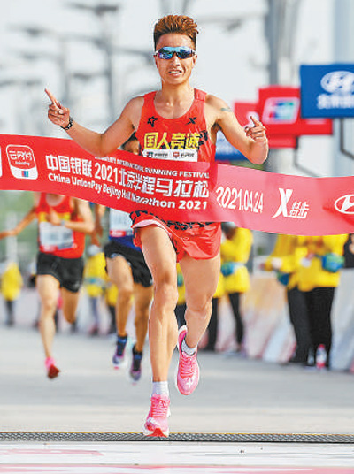 4月24日,2021北京半程马拉松开跑,马拉松名将彭建华率先撞线。 |