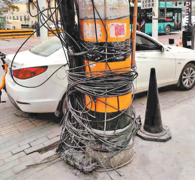 陕西西安市大庆路西段的一根电线杆上,缠绕着几十根电线,而且其中不少电线是早已废弃的(见图)。这根电线杆紧邻铁路,虽然铁路与电线杆之间增设了隔离墩,但仍存在安全隐患,也很影响市容市貌。希望当地有关部门尽快整理这根电线杆上的电线,消除安全隐患,维护城市环境。