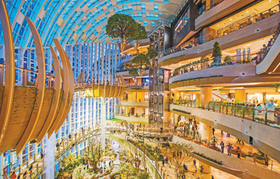 近日,重庆一家商业综合体在两江新区开业。在这座商业体内,拥有高达42米的立体垂直景观,20米高的室内景观瀑布飞流直下,近300种、7万株植物还原自然风貌,让消费者享受沉浸式购物体验。图为4月25日,市民在购物、休闲。