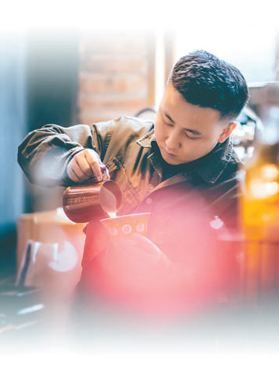 龙一弘在店里做咖啡。 |