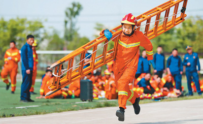 图为4月28日,消防员在进行“60米肩梯登楼”项目比赛。