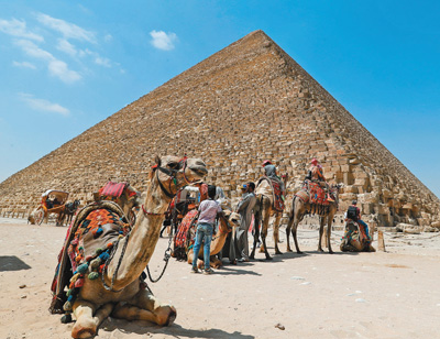 4月26日,游客在位于埃及吉萨省的金字塔群景区乘坐骆驼游玩。据埃及相关部门统计,受疫情影响,2020年埃及旅游业收入较2019年骤降近七成,游客人数下降73%。