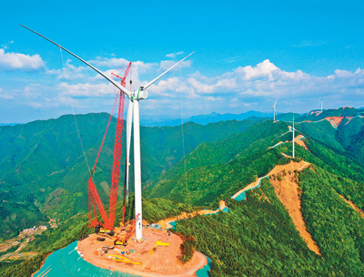 5月1日,湖南省永州市江华瑶族自治县萌渚岭风电场,工人在吊装风电机组。当天,各项目工地的工人坚守岗位赶工期,在岗位上度过劳动节。