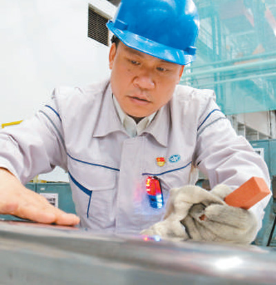 位于吉林省长春市的一汽解放汽车有限公司里,卡车厂冲压车间中机器的轰鸣声不断,随着冲压模具起落咬合,金属板材在模腔中被压制成各种形状。“它们组合在一起就成了卡车的外壳。”43岁的冯斌(上图,本报记者祝大伟摄)是冲压车间模修工段班长,带领班组负责薄板车间两条自动化冲压生产线冲压模具的维护工作。