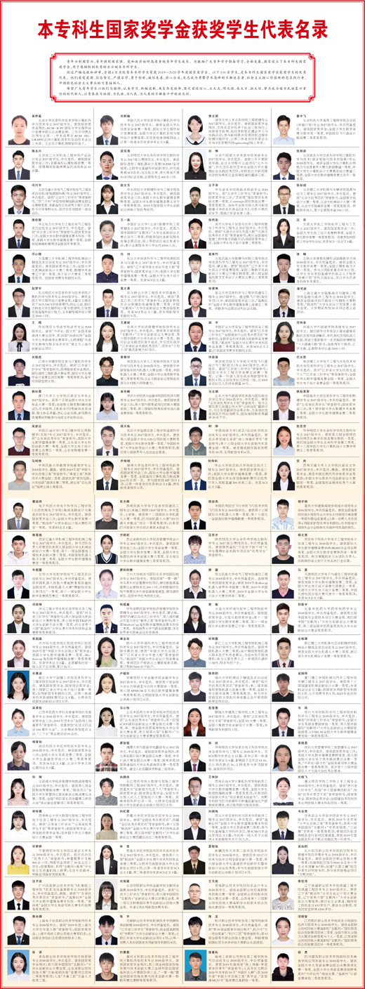 经过严格选拔和评审,全国6万名优秀本专科学生荣获2019—2020学年度国家奖学金。以下100名学生,是本专科生国家奖学金获奖学生的优秀代表。他们爱党爱国、信念坚定,严谨求学、勇于创新,诚信友善、热心公益,矢志成为勇攀学术高峰的不懈追求者、社会主义核心价值观的忠实践行者、中国特色社会主义事业的可靠接班人。