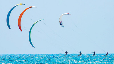 5月4日,海南琼海,游人在博鳌海滨体验风筝板冲浪。“五一”假期,大批游客来到博鳌海滨观光游览。 蒙钟德摄(人民视觉)