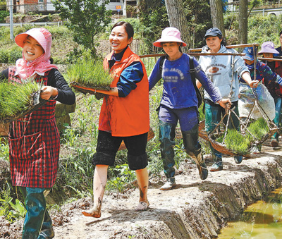 立夏时节,四川省达州市进入一年中水稻插秧的关键时期,该市组织各级机关党员抽出时间到帮扶联系村、社区开展“双报到帮帮团”志愿服务活动,义务帮助缺少劳动力的农户插秧。图为该市大竹县童家镇天星寨村,党员志愿者和村民在挑秧苗。